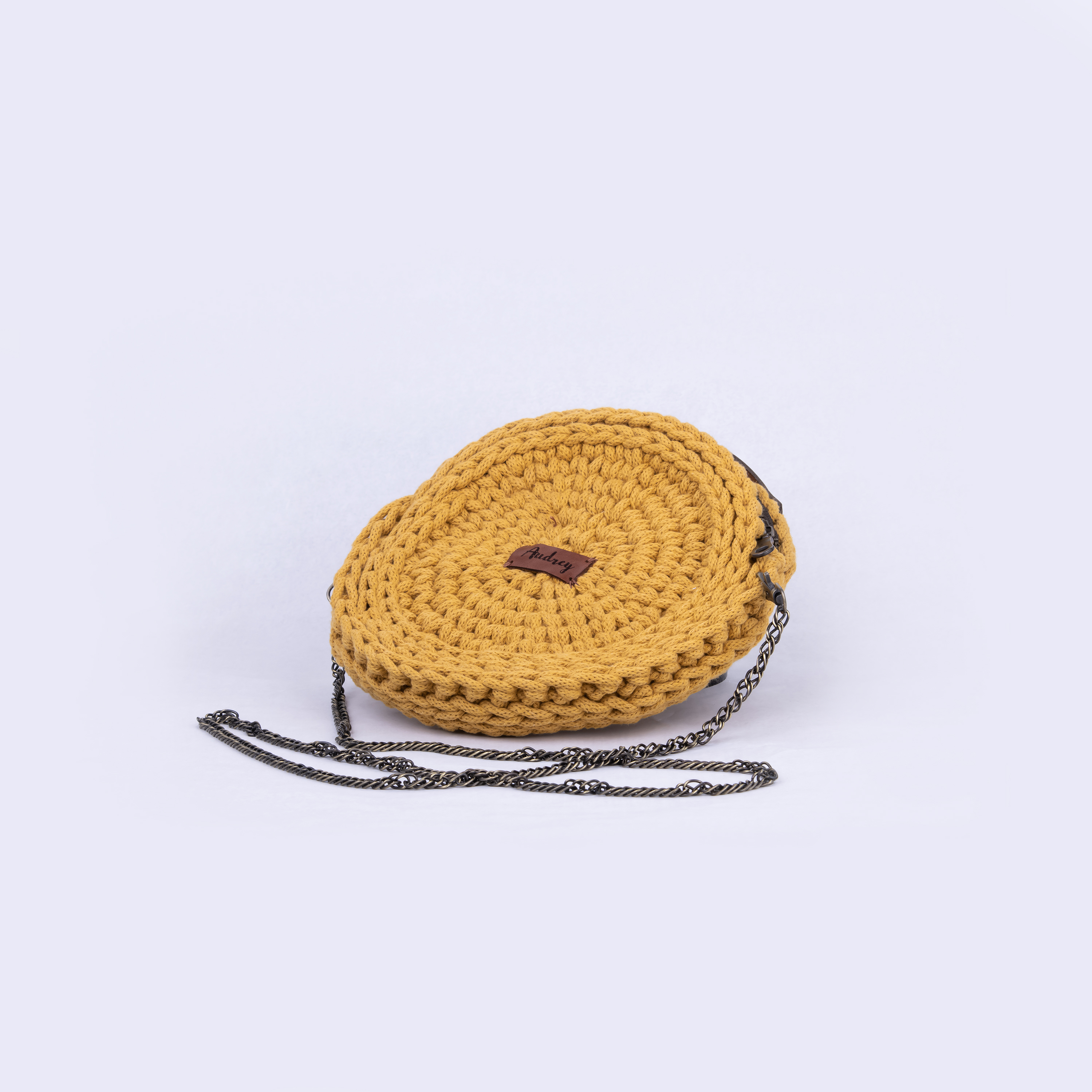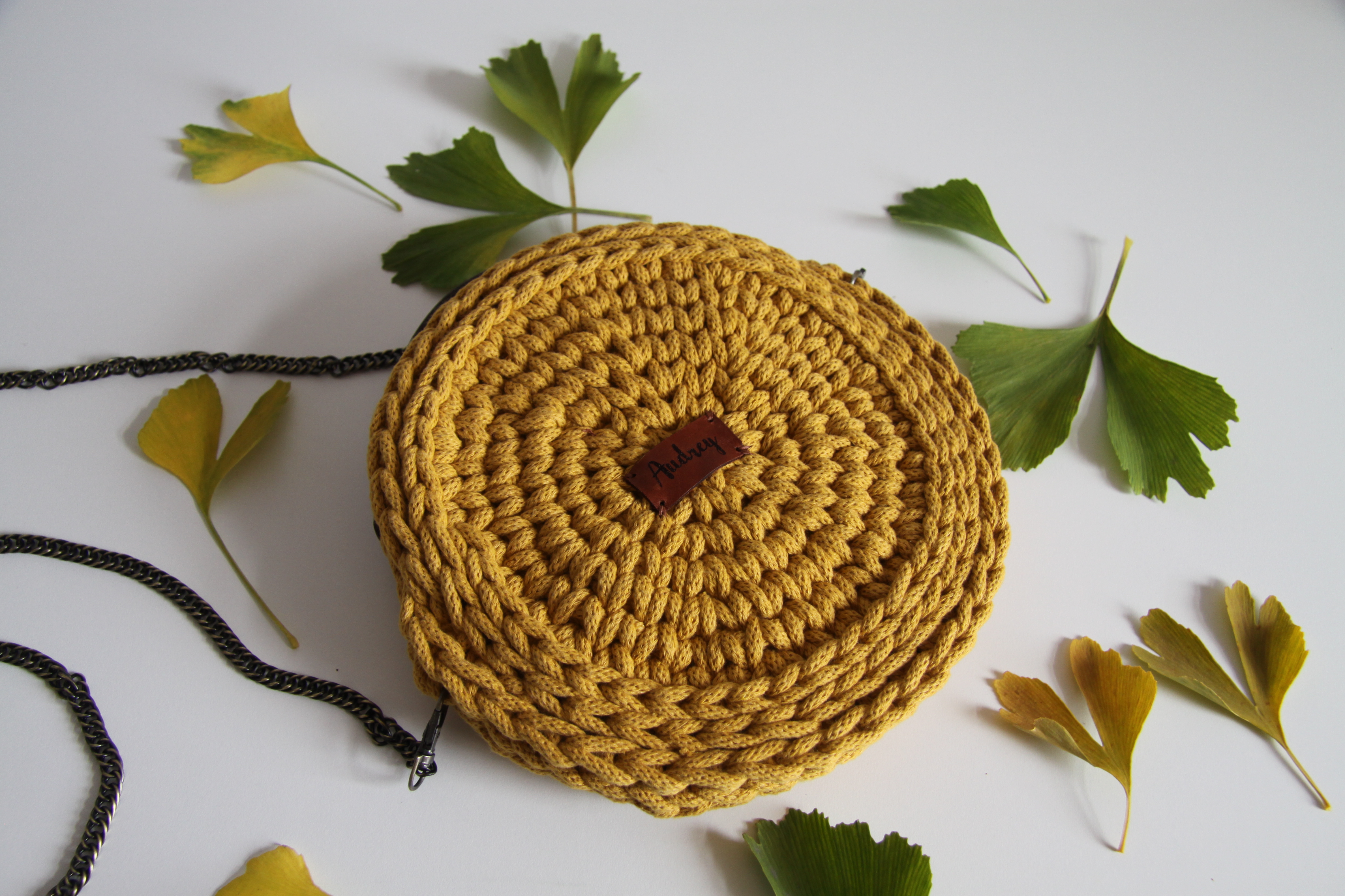 Malá kulatá kabelka v hořčicové barvě se zipem a řetízkovým popruhem a koženým uchem. Průměr kabelky je cca 25 cm a délka řetízkového popruhu je 120 cm. Řetížkový popruh se nezatrhává o jiné materiály.